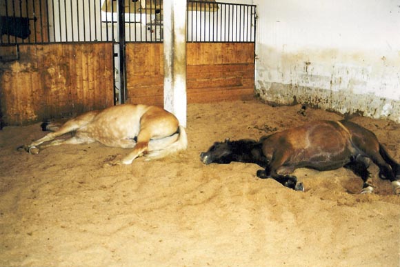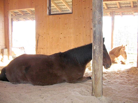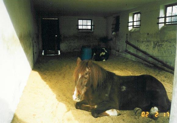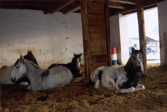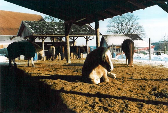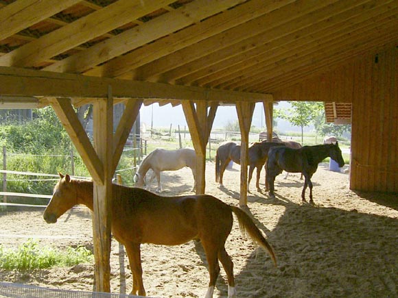 geschlossen und bieten daher ausreichend Schutz vor Wind und Regen. Für die vier Pferde im kleinsten Laufstall genügt ein Liegeplatz. Für die 13 Pferde im alten Laufstall stehen zwei Liegeplätze
