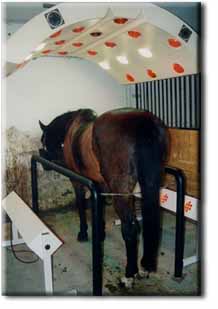 ![]() Damit die Pferde in der kalten Jahreszeit nicht verschwitzt in den Stall gestellt werden müssen steht ein Solarium zur Verfügung. Ein besonderer Vorteil unseres Solariums sind die seitlichen Lampen und Ventilatoren, die eine Trocknung der Flanken und des Bauchbereichs gewährleisten. |