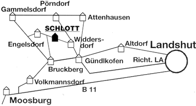 Von der A92 Autobahn - aus Deggendorf kommend: Ausfahrt Landshut West abfahren, Richtung Bruckberg, nach einem Kilometer bei Buchental rechts abbiegen; dem Strassenverlauf folgen, in Gündlkofen rechts über die Bahngleise, am Ortsausgang links abbiegen Richtung Widdersdorf; nach zwei Kilometer links abbiegen. Strassenverlauf bis Reitstall Schlott folgen Von der A92 Autobahn - aus München kommend: Moosburg Süd abfahren; Links Richtung Moosburg, nach 1km rechts abbiegen, nach 1km an der Ampel wieder rechts abbiegen auf die B11. nach 2km links abbiegen Richtung Volksmanndorf, über die IsarAmper Brücke, danach rechts Richtung Bruckberg. Gleich am Ortseingang links abbiegen und der Hauptstrasse folgen. (nach Tankstelle scharfe Linkskurve, nach Metzgerei scharfe Rechtskurve) nach Verputz Niedermaier links abbiegen und ca. 3km dem Strassenverlauf bis zum Reitstall Schlott folgen. Von Moosburg/Freising kommend: auf der B11 nach ca. 2km nach Ortsausgang Moosburg links Richtung Volksmanndorf, über die IsarAmper Brücke, danach rechts Richtung Bruckberg. Gleich am Ortseingang links abbiegen und der Hauptstrasse folgen. (nach Tankstelle scharfe Linkskurve, nach Metzgerei scharfe Rechtskurve) nach Verputz Niedermaier links abbiegen und ca. 3km dem Strassenverlauf bis zum Reitstall Schlott folgen. Von Landshut/Altdorf: Altdorf, Gündlkofen bei der Kirche rechts abbiegen; nach 200m am Ortsausgang links abbiegen Richtung Widdersdorf; nach zwei Kilometer links abbiegen. Strassenverlauf bis Reitstall Schlott folgen |