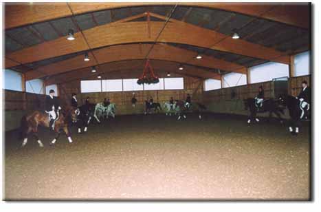 Reithalle 20 mal 40 Meter in freundlicher Leimbinderbauweise. Der Reithallenboden wird des öfteren geebnet und zweimal jährlich durch Zumischung von Frässpänen aufgebessert. Durch die Beregnunganlage wird die Halle auch im Hochsommer staubfrei gehalten. |
